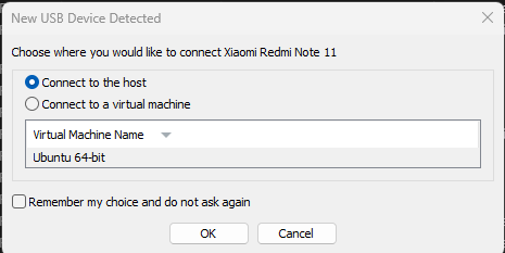 You can select “Remember my choice,” but it won’t change much. The device, in the process of flashing, will change its name so the VM will be confused and the pop-up will come back. This is not a problem in the beginning, but at the late flashing stage (about 90% done) you have to monitor the process and see if the pop-up appears. When left unattended for too long (3–5 min), it will cause an error and break the flashing process (ask me how I know). In that case, just rerun the flashing stage. It is easiest to turn up the volume of the host and listen to the device disconnect sound. When flashing is complete, remove the shorting cable, connect the screen, keyboard, and mouse, disconnect and reconnect the power cable, and boot up!
